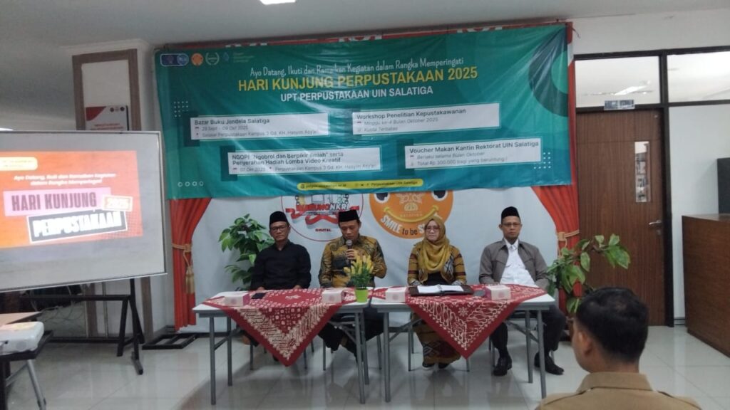 Salatiga, 7 Oktober 2025 — Dalam rangka memperingati Hari Kunjung Perpustakaan yang jatuh pada bulan September, UPT Perpustakaan UIN Salatiga menggelar kegiatan NGOPI (Ngobrol dan Berpikir Ilmiah) sekaligus Penyerahan Hadiah Lomba Video Kreatif Promosi Perpustakaan, bertempat di Perpustakaan Kampus 3 UIN Salatiga.