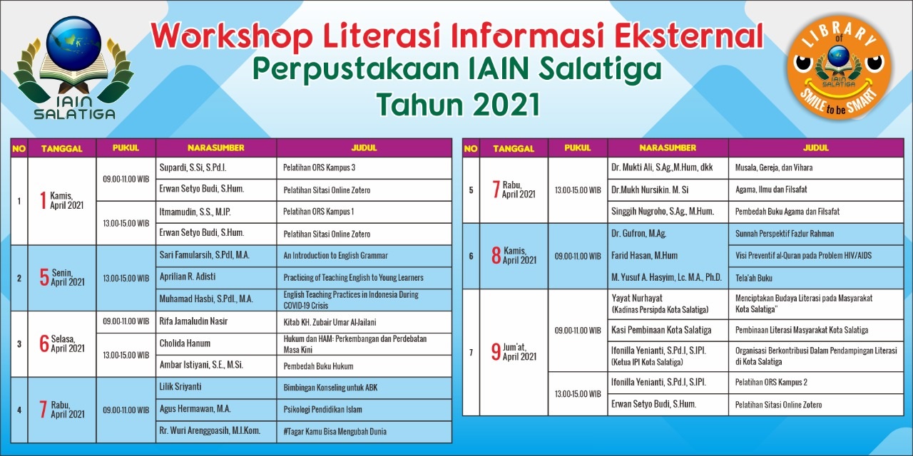 Salatiga – Kegiatan Workshop Literasi Informasi Perpustakaan IAIN Salatiga diadakan pada tanggal 1-9 April 2021. Kegiatan ini terdiri dari beberapa acara, antara lain bedah buku, literasi kitab, pelatihan Online Resources Skill (ORS) dan sitasi Zotero, serta workshop literasi informasi dengan menggandeng Dinas Perpustakaan dan Kearsipan Kota Salatiga. Dikarenakan masih dalam situasi pandemi, rangkaian acara ini berlangsung secara luring dan daring. Kegiatan yang diadakan secara luring dihadiri oleh 15 – 20 orang dengan tetap menerapkan protokol kesehatan. Sementara kegiatan yang diadakan secara daring dapat diakses dengan melakukan pendaftaran terlebih dahulu melalui link yang sudah tersedia.